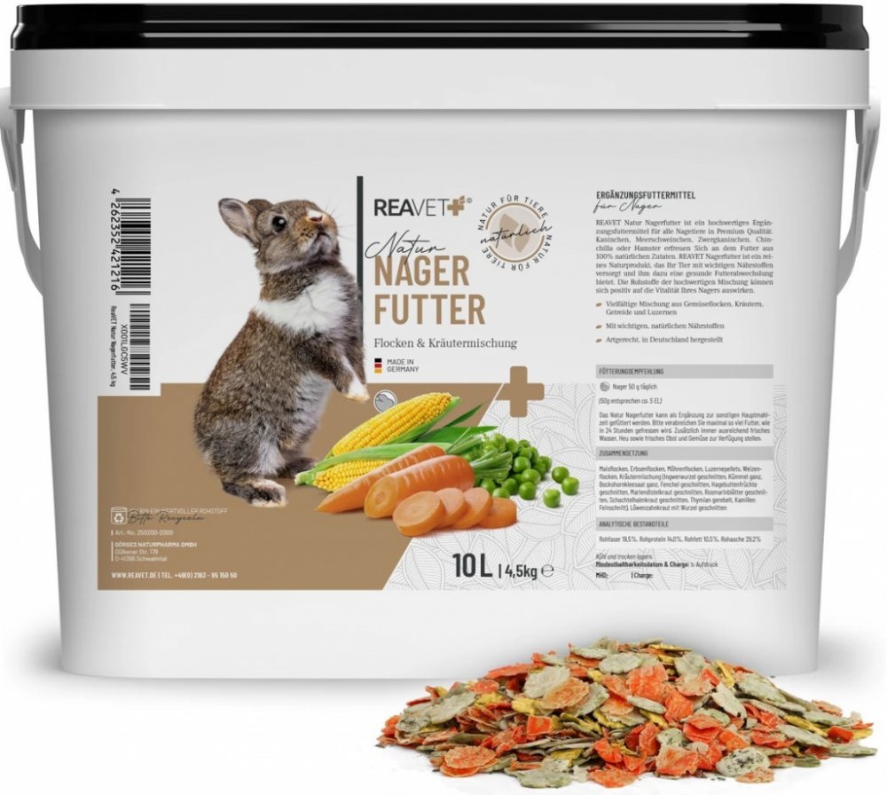 Přírodní krmivo pro hlodavce REAVET je vysoce kvalitní doplňkové krmivo pro všechny hlodavce v prémiové kvalitě. Na krmivu ze 100% přírodních surovin si pochutnávají králíci, morčata, zakrslí králíci, činčily nebo křečci. Krmivo pro hlodavce je čistě přírodní produkt, který poskytuje vašemu zvířeti důležité živiny prostřednictvím rozmanité směsi různých zeleninových vloček, obilovin, vojtěšky a bylin - včetně vysokého podílu pampelišky. Zdravá a bohatá rozmanitost surovin v této vysoce kvalitní směsi může mít pozitivní vliv na udržení zdraví vašeho hlodavce.