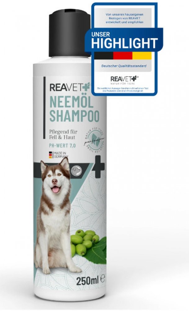 Náš REAVET šampon s neemovým olejem pro psy dodává srsti nový lesk! Kromě výživných a čistících složek tento šampon pro psy obsahuje vysoce kvalitní, za studena lisovaný neemový olej a neemový extrakt. Ideální na použití proti svědění, napadení hmyzem, roztoči a při podrážděné pokožce. Hodnota pH 7,0 je dokonale přizpůsobena pokožce psa. Neemový olej je také zdravější alternativou k chemickým prostředkům – může působit antivirově a podporovat pokožku po napadení parazity!