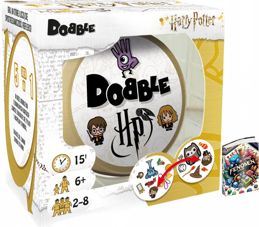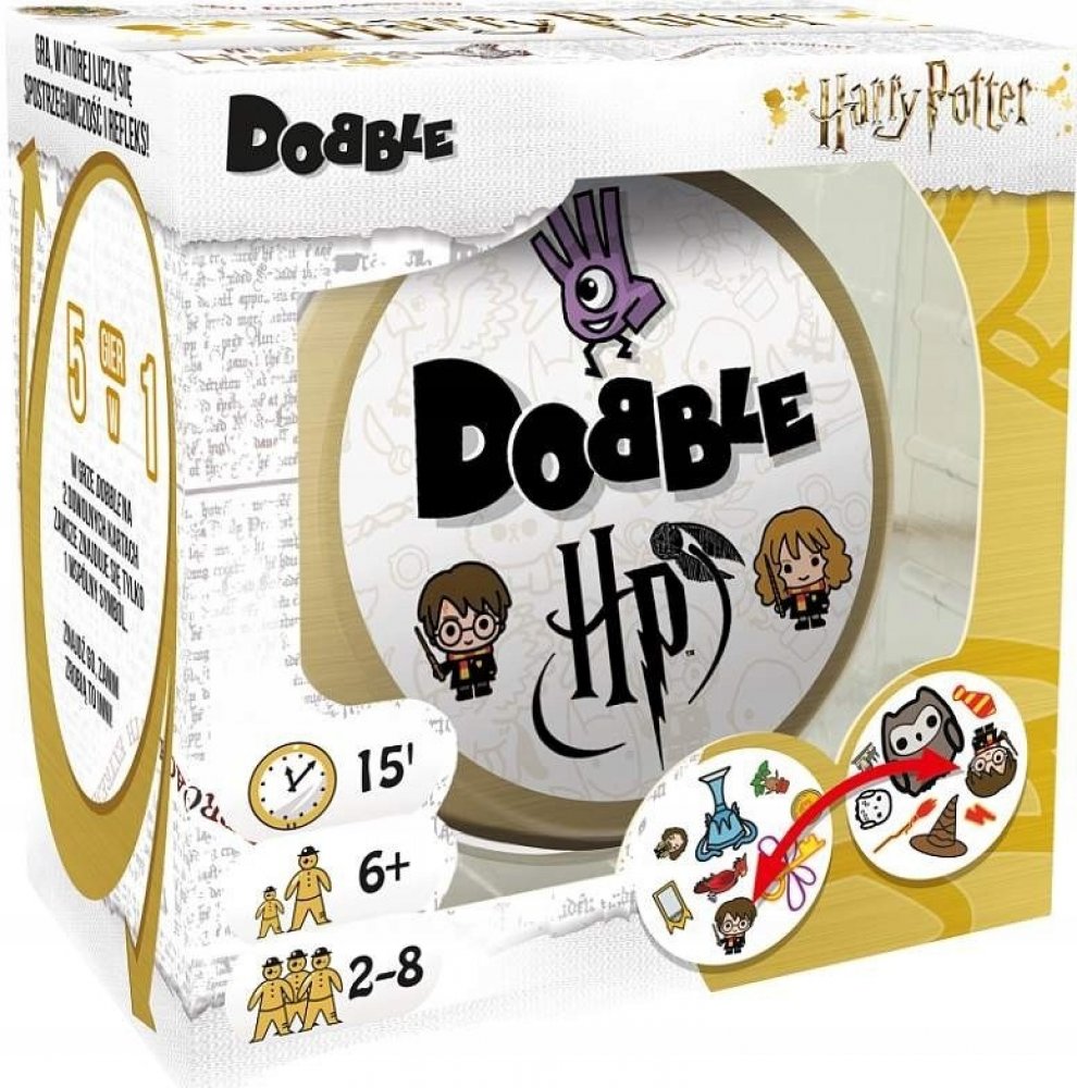 Dobble Harry Potter je jednou z nejočekávanějších her letošního roku! Spojuje kultovní svět magie a čarodějnictví společně s jednou z nejoblíbenějších rodinných her v Polsku. Hráči se snaží mezi dvěma kartami rozpoznat dvojici identických symbolů; ten, kdo je najde jako první, získá bod! V této verzi Dobble najdete stylizované obrazy z kultovního světa vytvořeného J. K. Rowlingovou: Harryho Pottera, Hermionu Grangerovou, Rona Weasleyho, ale také hůlky, stvoření, Bradavické erby a mnoho dalších. Dokážete je všechny najít?