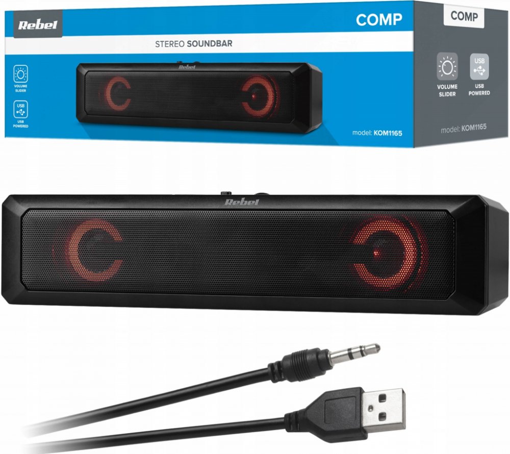 Pokud nemáte na stole dostatek místa, můžete si vybrat počítačový soundbar z řady Rebel Comp. Tento počítačový reproduktor s výkonem 2x 3 W vám zpříjemní každodenní práci s hudbou nebo sledování filmů. Za pozornost stojí i způsob připojení - jedná se o reproduktor k počítači přes USB. To znamená, že nevyžaduje další napájení ze sítě, takže jej můžete používat i na místě, kde není přístup k elektri...
