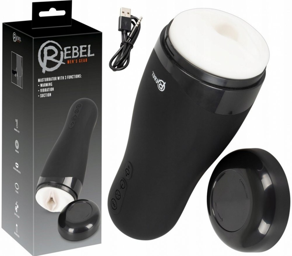 Heat, vibrations and suction feelings for the perfect solo! Handy masturbator with 3 functions from Rebel with exciting nubby soft sleeve in vagina look inside. Plus a heat function up to 42°C, varied 5 vibration modes in 3 speeds and an intense suction function in 3 modes. All functions can be controlled separately and conveniently at the touch of a button directly on the toy. The high-quality silicone material provides a very pleasant skin feeling during masturbation. The soft sleeve is removable for easy cleaning. The masturbator can be stored (dust-) safe and discreet with the included protective cap. Rechargeable - incl. USB charging cable. Total length 26 cm, insertion depth 15.5 cm, inner Ø 2.8 cm (slightly stretchable). Weight 914 g. Silicone, PU, ABS, TPE.