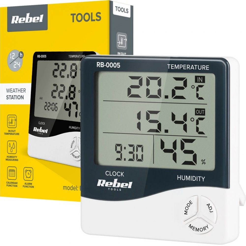 Domácí meteorologická stanice Rebel Tools RB-0005 byla také vybavena dalšími funkcemi. Zařízení má kalendář a hodiny s nastavením budíku , které vám umožní nahradit tradiční budík. Velkou výhodou stanice je, že tam jebezdrátové , takže je můžete snadno umístit kamkoli.