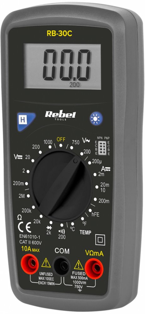 Univerzální měřič REBEL RB-30C je všestranný nástroj, který je ideální pro širokou škálu elektrických a elektronických měření. Díky své funkcionalitě a robustní konstrukci je ideální volbou jak pro profesionály, tak pro kutily.