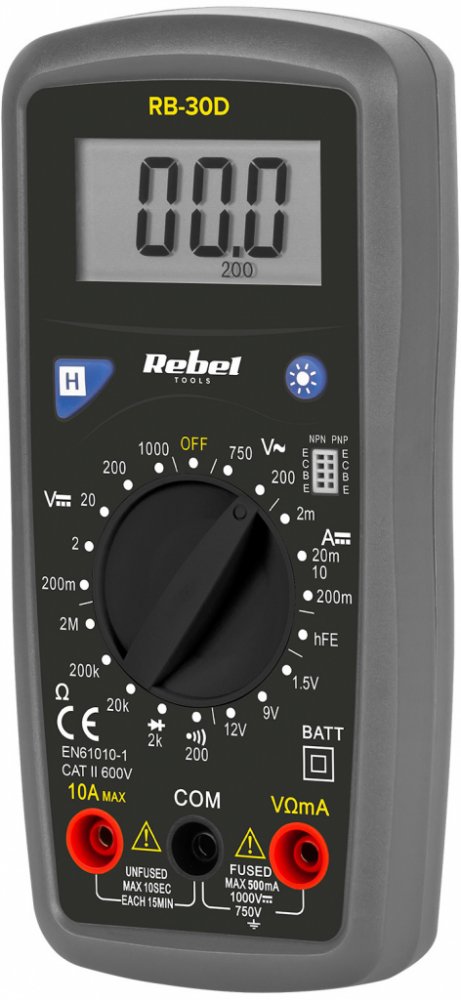 Elektroměr REBEL RB-30D umožňuje přesné měření stejnosměrného (DC) napětí v rozsahu 200 mV až 1000 V a střídavého proudu (AC) do 750 V, což umožňuje diagnostiku různých elektrických zařízení a instalací. Měření stejnosměrného proudu (DC) do 10 A a odporu do 2 MOhm poskytuje všestrannost a přesnost potřebnou při práci s elektronickými obvody. Kromě toho má měřič funkce pro testování diod, hFE tranzistorů a kontrolu kontinuity obvodu, což zvyšuje jeho univerzálnost.