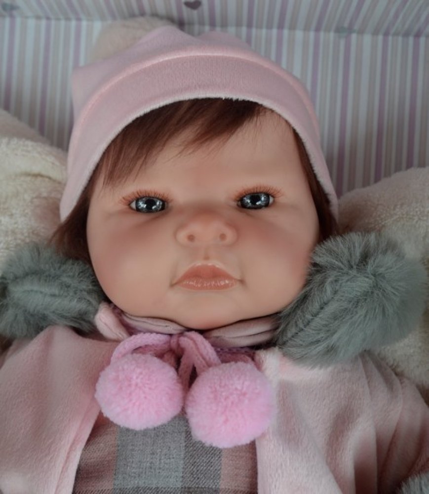 Miminko je oblečeno v růžovo-šedých kostkovaných šatech a růžovém semišovém kabátku ozdobeném šedou "kožešinou" na manžetách a límci. Na hlavě má růžovou čepici s bambulí a na nohou šedé ponožky. Miminko leží na bílém polštářku, má certifikát o původu a dudlík, který nejde do pusinky, je jen dekorativní.