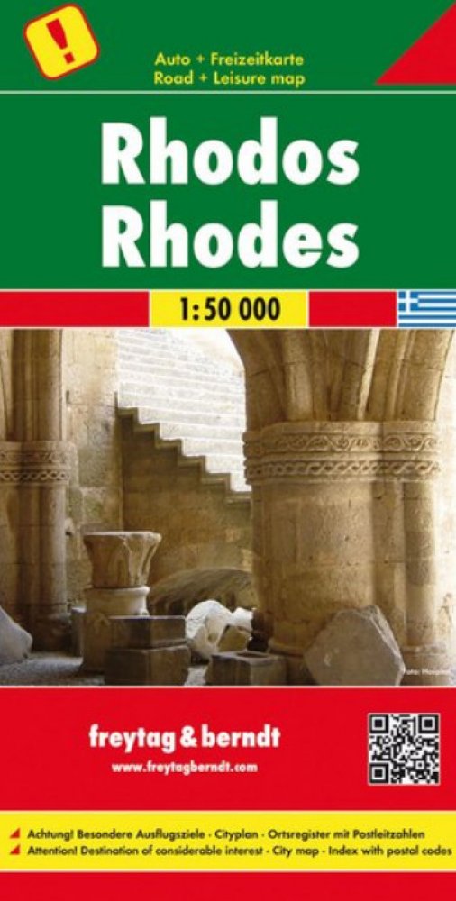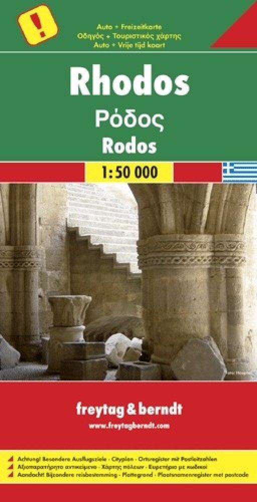 Jednostranná regionální automapa Rhodosu. Mapa s bohatým turistickým obsahem je svým měřítkem vhodná pro poznávání regionu autem či na kole (cyklotrasy). Silniční síť je označena čísly komunikací, zvýrazněny placené úseky silnic, symbolické znaky pro benzínové stanice, odpočívadla, motely, kilometráž, uzavřené úseky. Vedle dopravních informací jsou zaznačeny přírodní rezervace, panoramatické cesty...