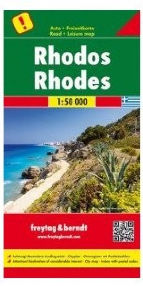 Jednostranná regionální automapa Rhodosu. Mapa s bohatým turistickým obsahem je svým měřítkem vhodná pro poznávání regionu autem či na kole (cyklotrasy). Silniční síť je označena čísly komunikací, zvýrazněny placené úseky silnic, symbolické znaky pro benzínové stanice, odpočívadla, motely, kilometráž, uzavřené úseky. Vedle dopravních informací jsou zaznačeny přírodní rezervace, panoramatické cesty s krásnou vyhlídkou, turistické značené trasy, kulturní zajímavosti, znaky pro tábořiště, kempy. Turistické cíle jsou doplněné o hvězdičkové hodnocení zajímavosti (podobně jako v průvodcích). Výškopis je v mapě vyznačen pomocí stínování. Přiložená brožura s rejstříkem sídel a čyřjazyčným místopisem. Česká legenda.