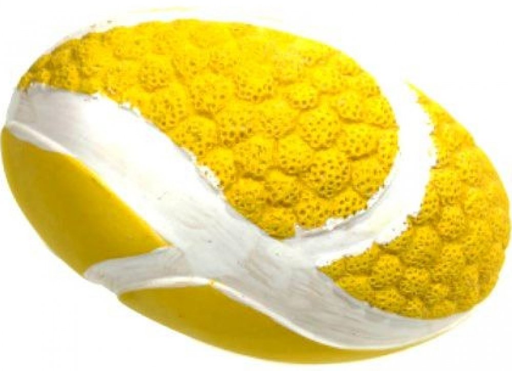 Gumový pískací míček od italského výrobce RECORD o rozměrech 7 x 10 cm, s integrovaným pískátkem.