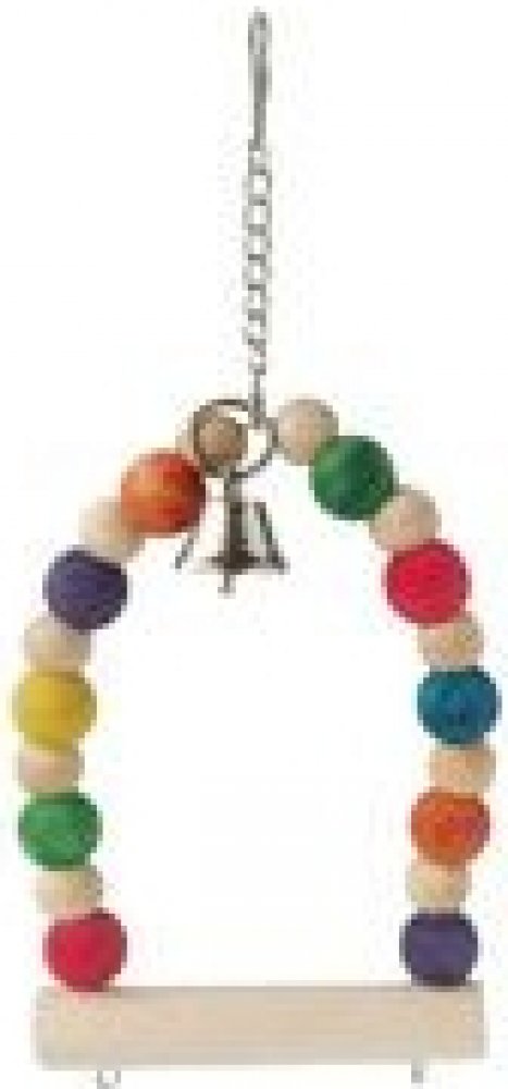 Houpačka pro střední papoušky. Celková délka včetně závěsu je 27 cm. Obsahuje řetízek s karabinou, zvoneček, bidlo s korálkovým obloukem. Barevné dřevěné korálky jsou provlečeny na obloukovém drátu připevněném k bidlu. Výška od bidla je 16 cm.