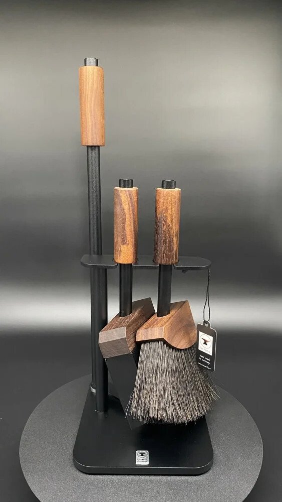 Třídílná krbová souprava s lopatkou, smetáčkem a pohrabáčem Red Anvil Black BOOM-2+1. Na volně stojícím rámu vyrobeném z nerezové oceli jí lze umístit kdekoli. Smetáček je vyroben z palmových vláken Arrenga zpomalující hoření, lopatka má obdélníkový tvar. Rukojeti jsou vyrobeny z masivního dřeva. Celá krbová souprava nářadí je černě lakovaná. Prvotřídní nářadí nejvyšší kvality, které se skvěle hodí do každého moderního interiéru. Výška soupravy s pohrabáčem je 45 cm.