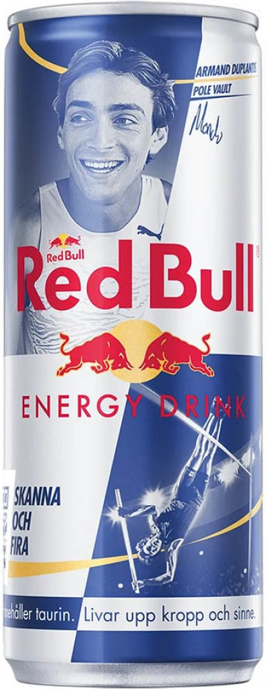 Energetický nápoj Red Bull s klasickou příchutí ve verzi pro Švédsko s rekordmanem ve skoku o tyči Armandem Duplantisem.