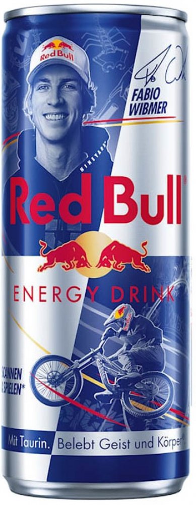 Energetický nápoj Red Bull s klasickou příchutí ve verzi pro Rakousko v limitované edici Fabio Wibmer.
