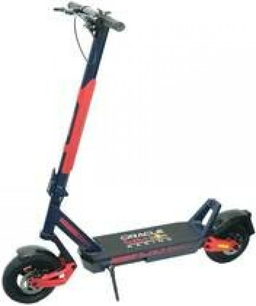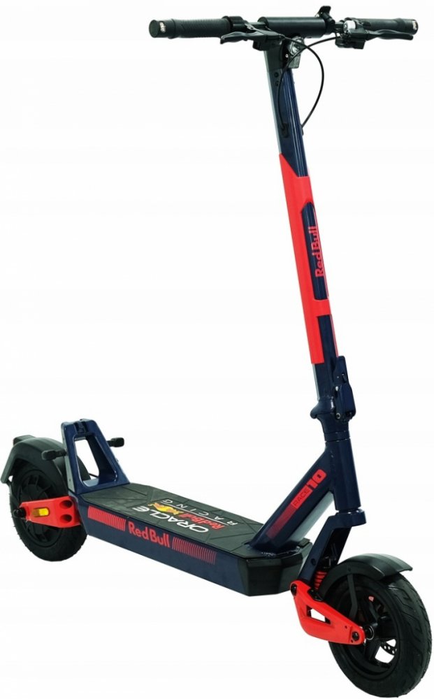 Pocit výjimečnosti podtrhují prostorově výrazná gumová nášlapová plocha, která je vyvedena v pestrých barvách a grafice ORACLE RED BULL RACING. Logo na boku koloběžky, nebo na řídící tyči překrývá ochranná fólie. Zadní i přední blatník disponují kovovou výztuhou znesnadňující poškození. Viditelnost koloběžky vzadu zajišťuje 6 LED diod, které jsou viditelné i za slunečného dne a přední osvětlení pak jeden světlomet umístěný přímo na řídící tyči, takže světelný kužel vždy následuje směr do kterého se jezdec hodlá ubírat.
