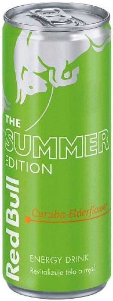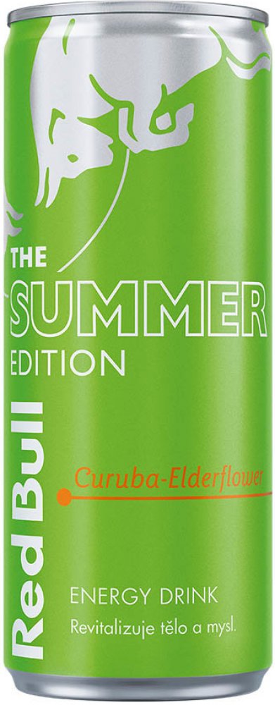 Energetický nápoj Red Bull s příchutí curuby a bezového květu v letní limitované edici pro rok 2024. Složení: voda, sacharóza, glukóza, kyselina (kyselina citronová), oxid uhličitý, taurin (0,4 %), regulátor kyselosti (citronany sodné), kofein (0,03 %), vitamíny (niacin, kyselina pantothenová, B6, B12), aromata, barviva (karamel, riboflaviny). Nevhodné pro děti, těhotné ženy a kojící ženy. Obsah ...