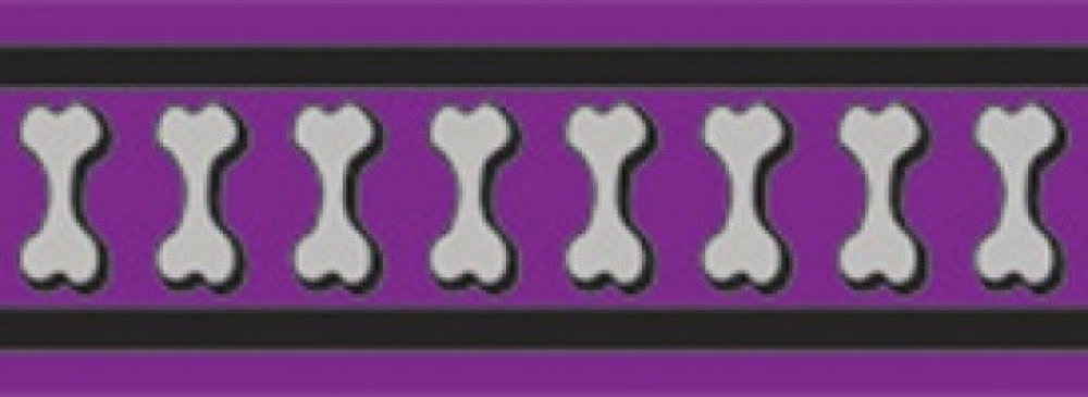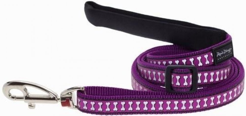 Klasické vodítko Red Dingo pro psy. Délku je možné jednoduše nastavovat pomocí jezdce v rozmezí 1,0 – 1,8 m. Šířka popruhu 12 mm. Vzor reflexní Lots a Bones. Barva fialová.