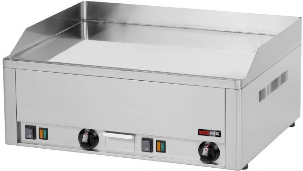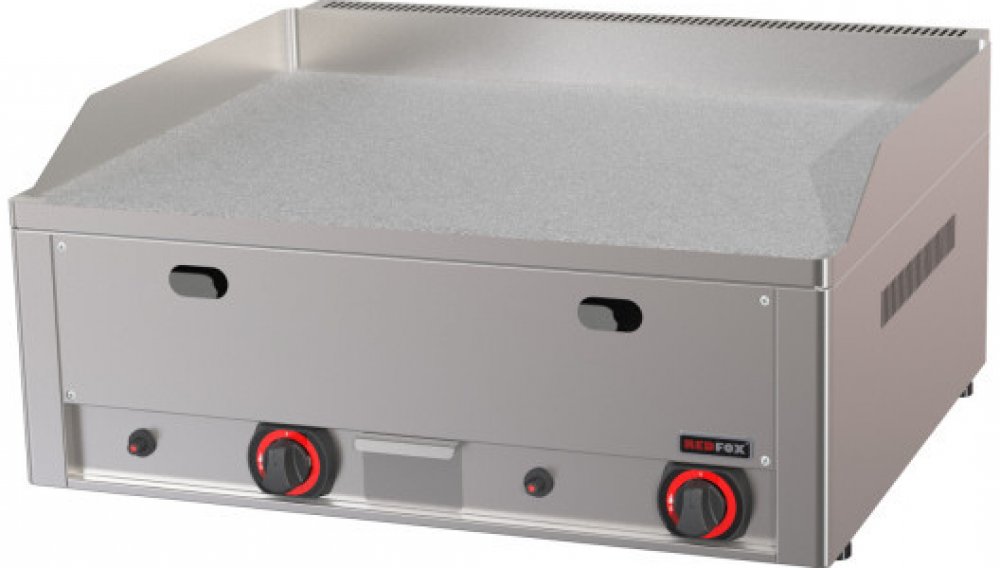 Grilovací deska chromovaná hladká REDFOX. Celonerezové provedení. Chromovaná pracovní plocha. Produkt se méně napéká - snadné čištění. Plynová. Piezzo zapalování. Nádobka na tuk. Lopatka. Každá polovina samostatně ovládaná. Dodáno v provedení PB + trysky na zemní plyn.