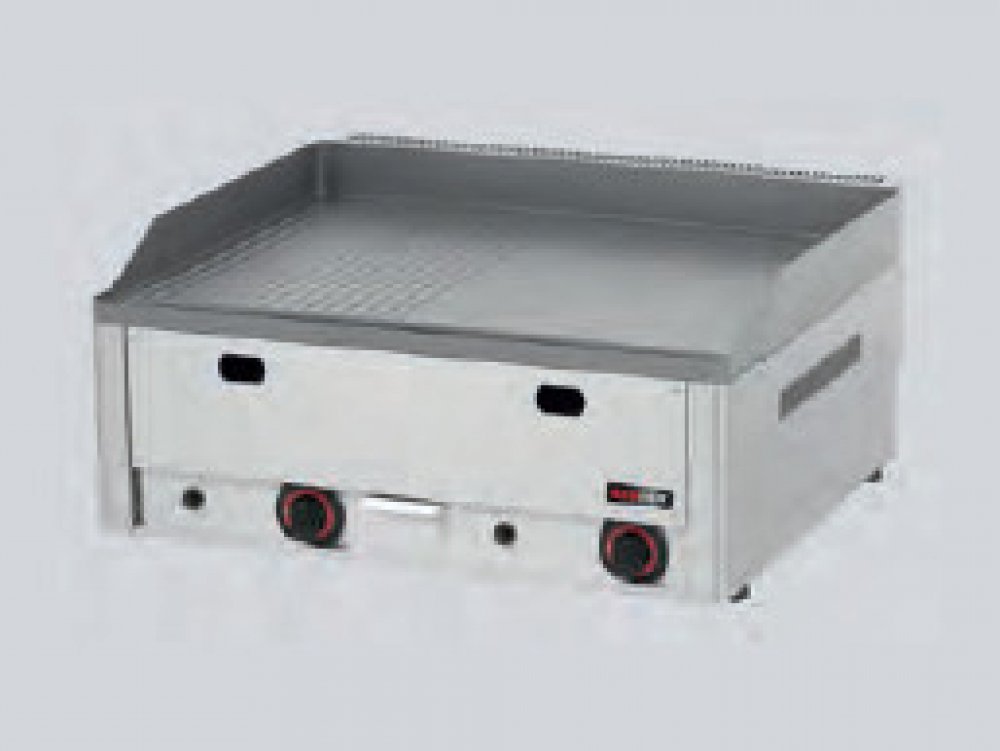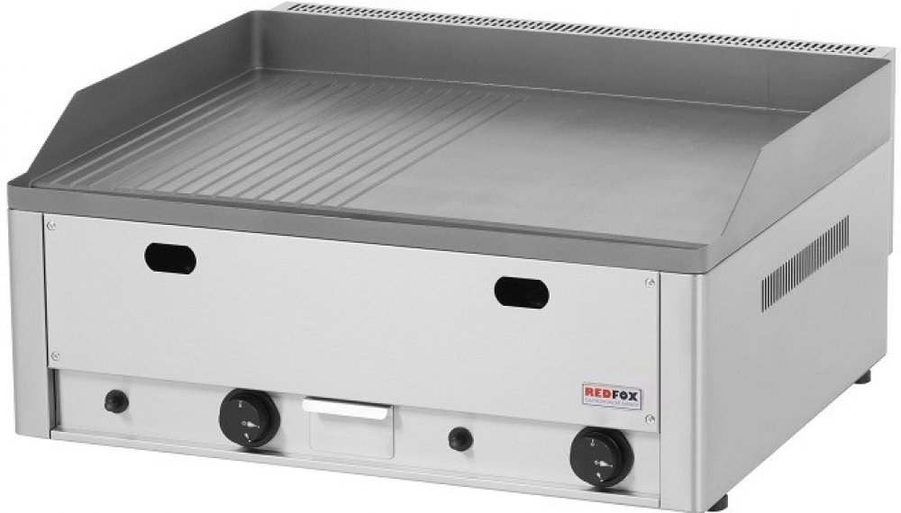 Grilovací deska kombinovaná REDFOX. Grilovací deska kombinovaná plynová. Celonerezové provedení. Pracovní plocha z teplovodné slitiny. Piezzo zapalování. Nádobka na tuk. Lopatka. Každá polovina samostatně ovládaná. Dodáno v provedení PB + trysky na zemní plyn.