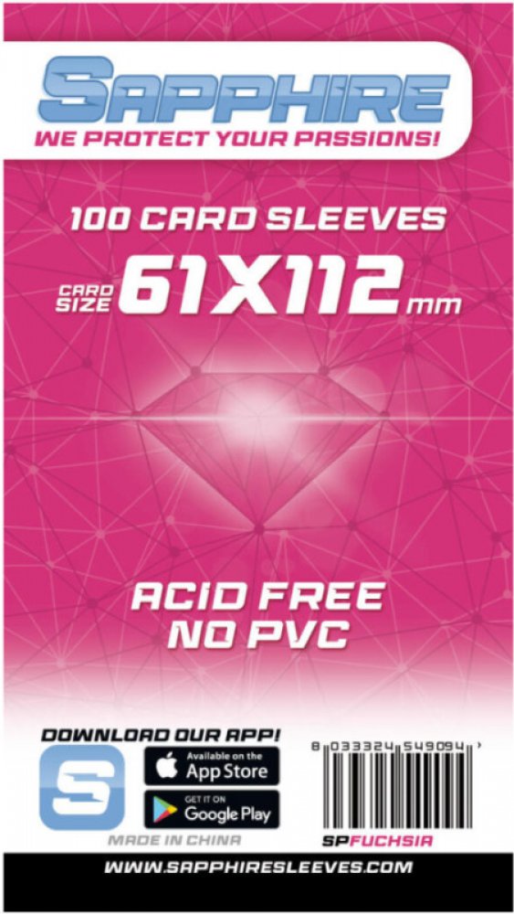 Obaly na karty Fuchsia od firmy Sapphire jsou určeny pro karty o rozměrech 61 x 112 mm. Jsou vhodné např. na karty z her 7 divů světa Duel: Pantheon nebo Vúdú. S nimi budou mít vaše karty tu správnou pevnou ochranu a navíc nebudou v obalech plavat. Šikovná věc pro ty, kdo si chtějí zachovat své hry na delší dobu. Tyto obaly jsou o 50% pevnější než běžné obaly např. Ultra Pro Economy nebo Blackfire.