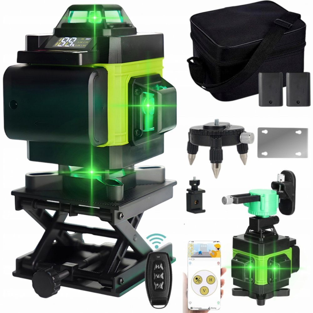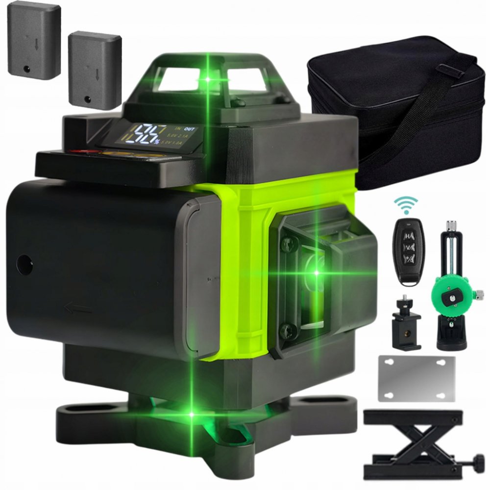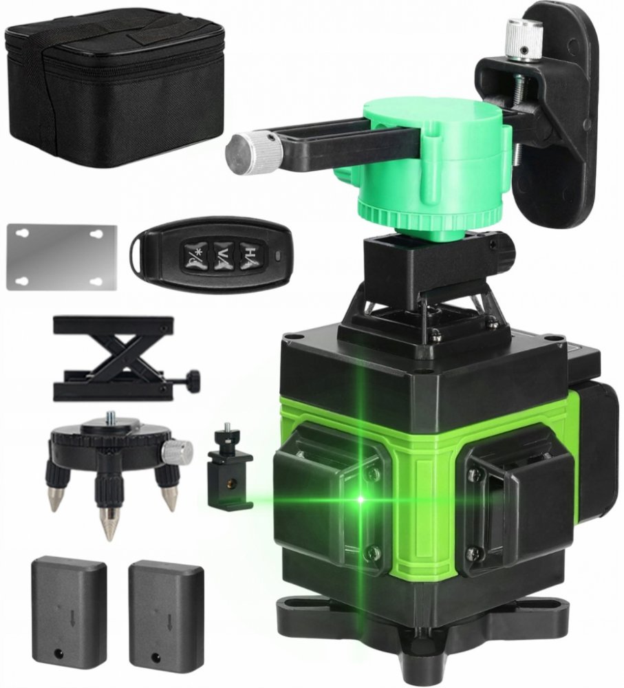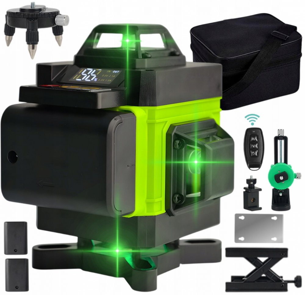 Křížový laser s 360° 4D, se zeleným paprskem, představuje výkonný nástroj pro přesné zaměřování a nivelaci. Laser disponuje konstantním provozním režimem s detektorem laserového paprsku, který zvyšuje dosah laseru, a také manuálním provozním režimem. Se stupněm krytí IP54 proti vodě a prachu je tento laser vhodný pro použití v různých podmínkách. Laser má 1/4" závit pro snadnou montáž na stativ a kyvadlový zámek pro bezpečnou přepravu. Dálkové ovládání umožňuje pohodlné nastavení a manipulaci s laserem. Displej zobrazuje stav nabití baterie. Zelené brýle a terč jsou součástí balení, stejně jako různé druhy úchytů a adaptér závitů pro flexibilní použití.