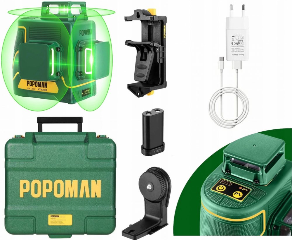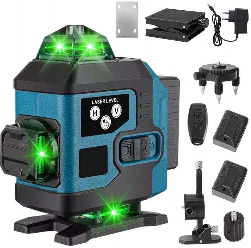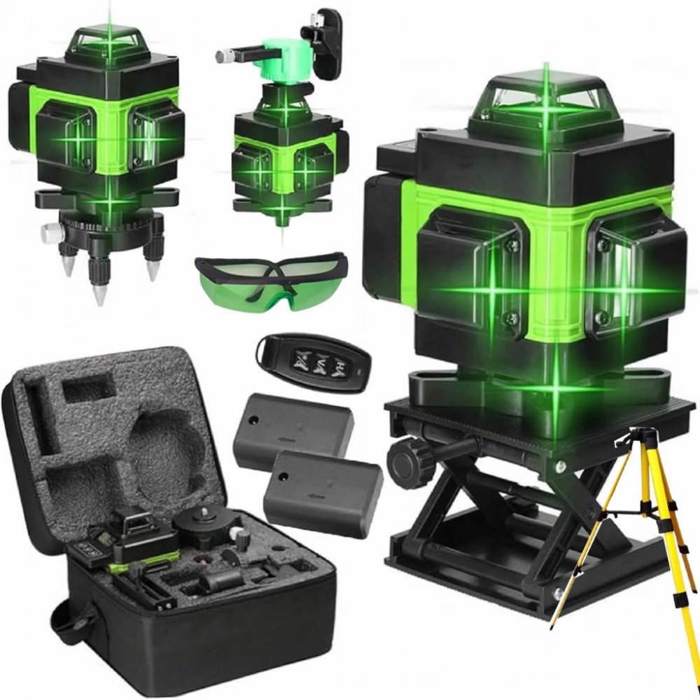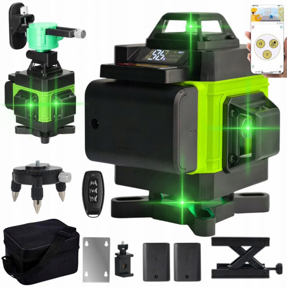 Křížový laser s 360° 4D, se zeleným paprskem, představuje výkonný nástroj pro přesné zaměřování a nivelaci. Laser disponuje konstantním provozním režimem s detektorem laserového paprsku, který zvyšuje dosah laseru, a také manuálním provozním režimem. Se stupněm krytí IP54 proti vodě a prachu je tento laser vhodný pro použití v různých podmínkách. Laser má 1/4" závit pro snadnou montáž na stativ a kyvadlový zámek pro bezpečnou přepravu. Dálkové ovládání umožňuje pohodlné nastavení a manipulaci s laserem. Displej zobrazuje stav nabití baterie. Zelené brýle a terč jsou součástí balení, stejně jako různé druhy úchytů a adaptér závitů pro flexibilní použití.