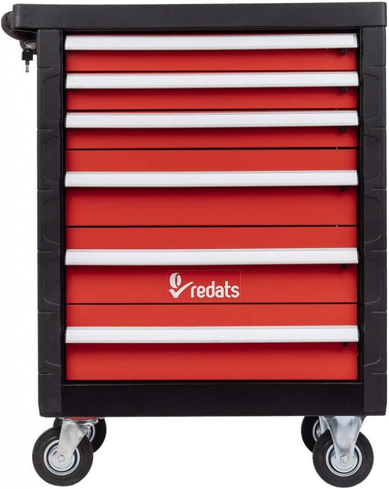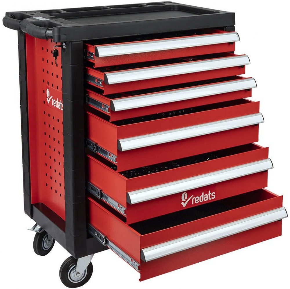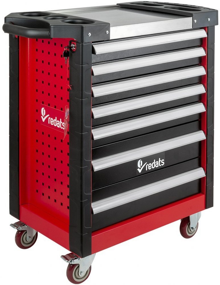Servisní vozík určená do dílny sestává ze sedmi zásuvek, přičemž pět zásuvek je vybaveno profesionálním dílenským nářadím, které jistě při své práci využijete. Zásuvky s kuličkovými ložisky budou jednoduše a snadno zasouvat i vysouvat. Vrchní zásuvka je opatřena zámkem, který po zamknutí automatický uzavře všechny zásuvky. Skříňka je díky mohutné a kvalitní konstrukci, která je vyrobena z dvojitéh...