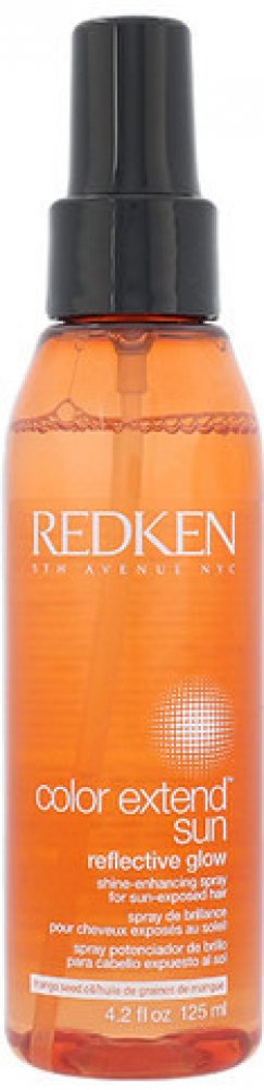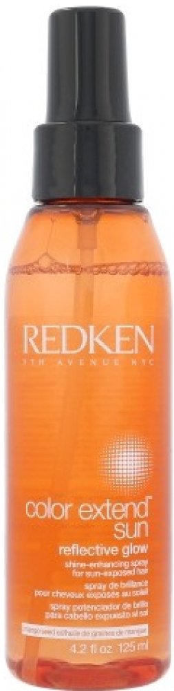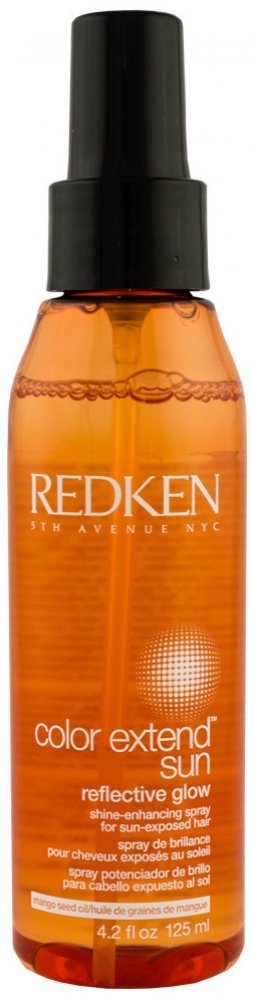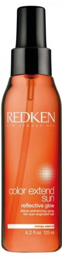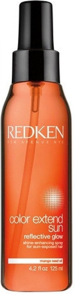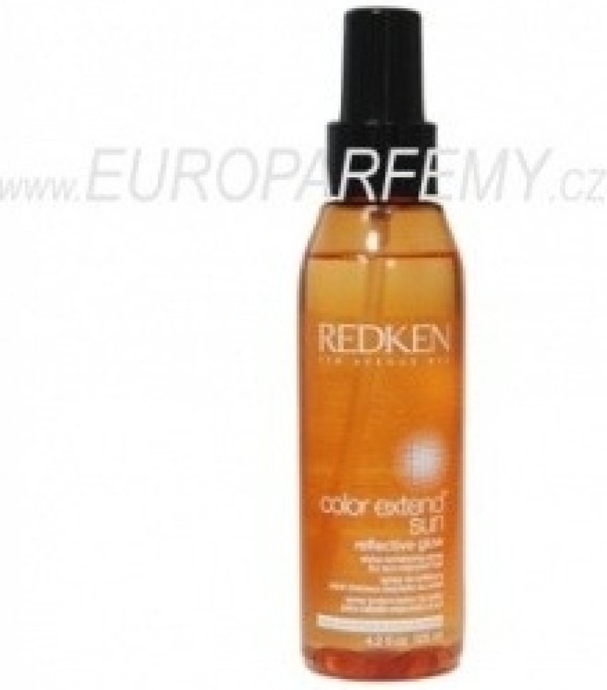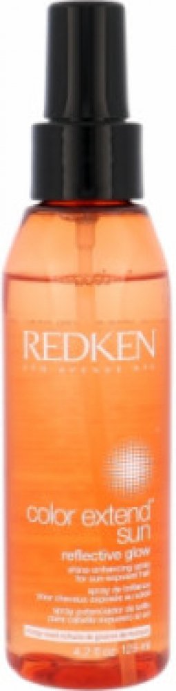Vlasový sprej **Redken Color Extend Sun Reflective Glow**. Vlasový sprej Redken Color Extend Sun Reflective Glow rozjasňuje barvu a navrací vlasům lesk. Vlasový sprej je ideální pro vlasy namáhané sluncem. **Použití**: Důkladně protřepejte a aplikujte do suchých nebo vlhkých vlasů. Neoplachujte.