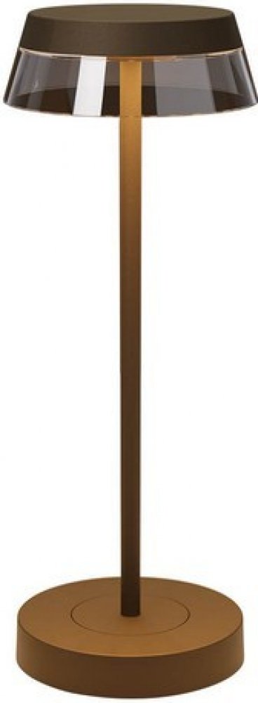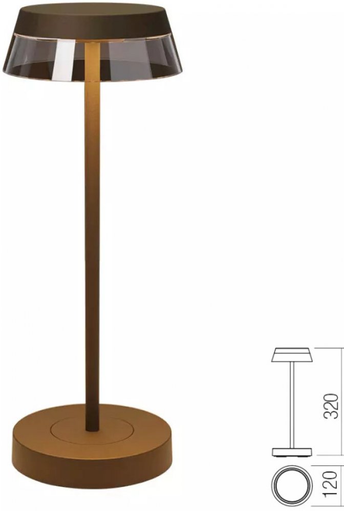 Exteriérové stolní svítidlo vybavené SMD LED diodami, zapínáním/vypínáním a stmívačem, plynule stmívatelné 100% - 5%, s pamětí jasu a barevné teploty, možnost změny barevné teploty od 2700K do 3000K. Vybavena Li-ion baterií, kapacita 3.000 mA, se samoochranným systémem proti přetížení, jednokontaktní nabíjecí základna s 1,5m USB kabelem a adaptérem (součástí balení) vstup 100 - 240V, výstup DC 5V/1A. Doba plného nabití 4,5 hodiny, doba provozu (po úplném nabití) 7,5 hodiny. Konstrukce z tlakově litého hliníku lakovaná v barvě corten, průhledný polykarbonátový difuzor.