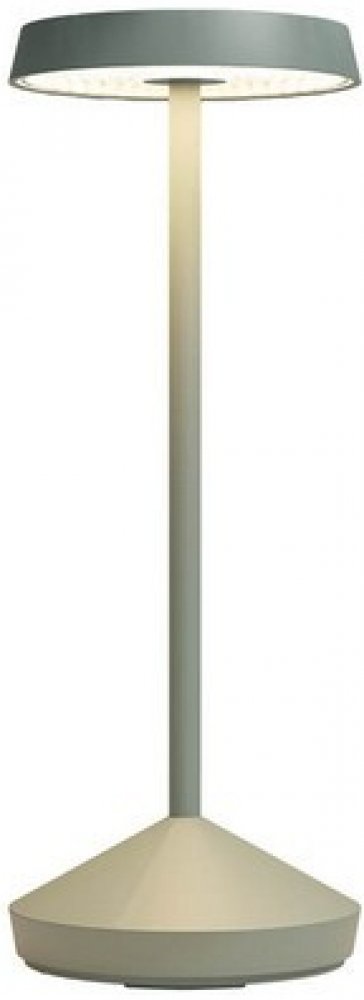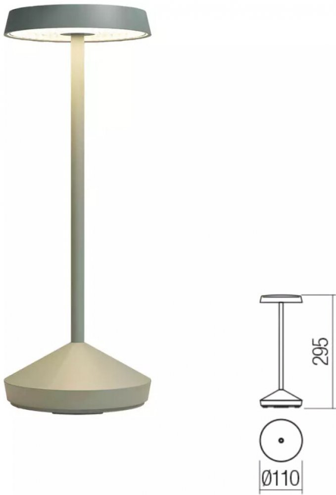 Interiérová stolní lampa vybavená SMD LED diodami, dotykovým vypínačem ON/OFF a dotykovým stmívačem, plynule stmívatelná 100% - 5%, s pamětí jasu a možností změny teploty barev z 2700K na 3000K. Vybaveno lithium-iontovou baterií 18650, kapacitou 2.200 mA x 2, systémem ochrany proti přetížení, zásuvkou micro USB a nabíjecí základnou pro jeden kontakt (součást dodávky) 110 - 240 V, 50/60 Hz. Plná doba nabíjení 6 hodin, pracovní doba (po úplném nabití) 9 hodin. Tělo z hliníkového tlakového odlitku lakované matnou šalvějově zelenou barvou, s průhledným polykarbonátovým difuzorem.
