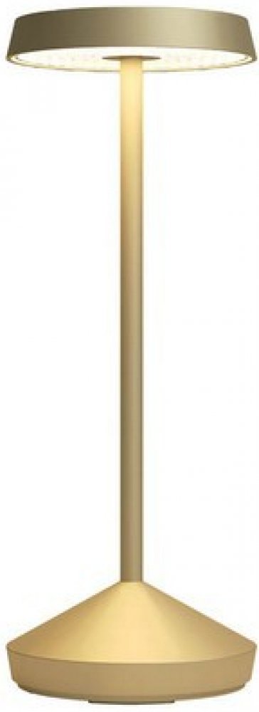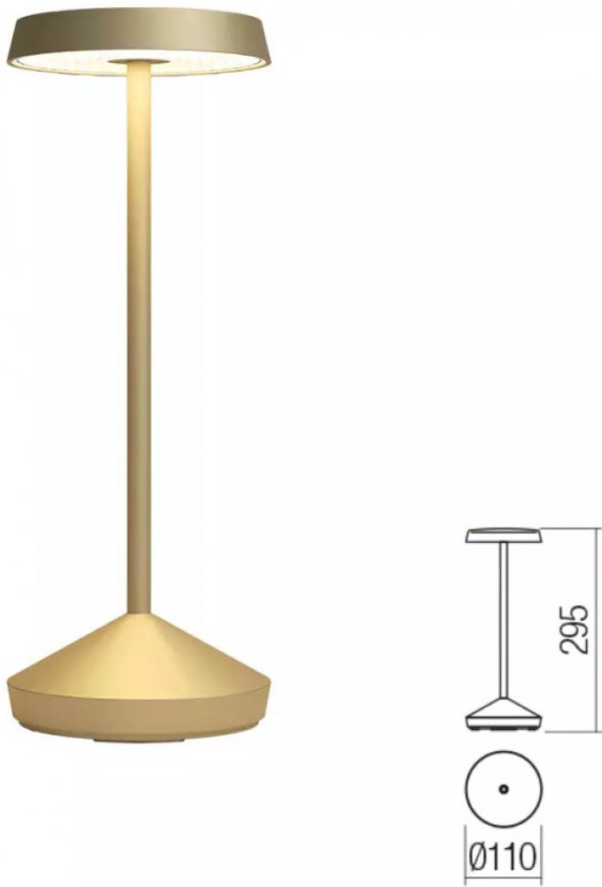 Exteriérová stolní lampa vybavená SMD LED diodami, dotykovým vypínačem ON/OFF a dotykovým stmívačem, plynule stmívatelná 100% - 5%, s pamětí jasu a možností změny teploty barvy od 2700K do 3000K. Vybavena baterií 18650 Li-ion, kapacita 2.200mA x 2, se systémem samoochrany proti přetížení, zásuvkou micro USB a jednokontaktní nabíjecí základnou (součástí balení) 110 - 240 V, 50/60 Hz. Doba plného nabíjení 6 hodin, doba provozu (po úplném nabití) 9 hodin. Konstrukce z tlakově litého hliníku lakovaná v matné zlaté, průhledný polykarbonátový difuzor.