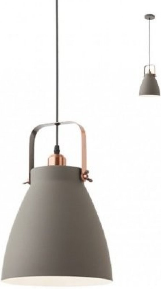 Závěsné interiérové ​​svítidlo, kovová konstrukce a difuzor lakovaná v matné šedé barvě s měděnými detaily.