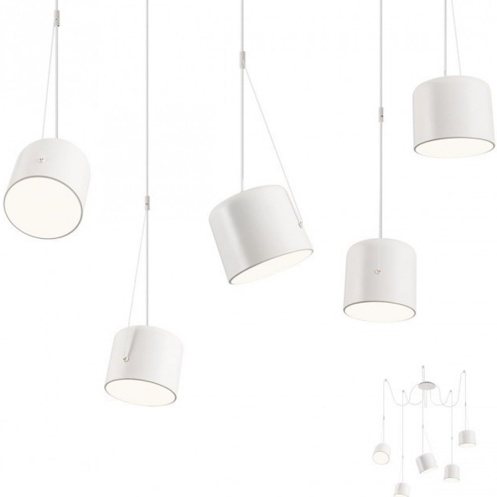 Závěsné interiérové svítidlo vybaveno pěti paticemi E27 o maximálním výkonu 5x15W. Konstrukce a difuzor jsou vyrobeny z kovu, elektrostaticky lakovány do matné bílé barvy. Reflektor je vyroben z bílého PMMA. Svítidlo se dodává s pěti třímetrovými bílými textilními kabely a pěti kovovými příchytkami pro montáž na strop. Můžete si dokoupit rozetu se sedmi vývody a vytvořit si tak více závěsů na libi...