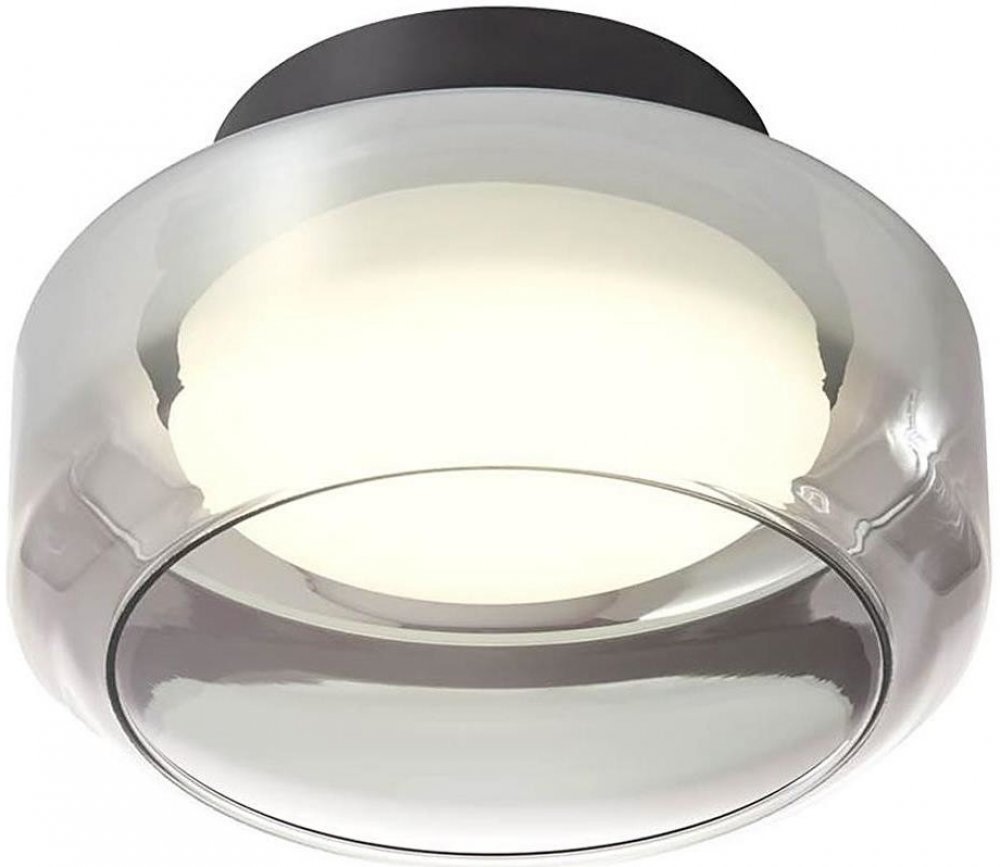 Stropní svítidlo do interiéru, vybavené LED diodami SMD, s možností volby teploty barvy světla, kovová a hliníková konstrukce elektrostaticky lakovaná pískově černou barvou, dva difuzory z foukaného skla, zvenku kouřové barvy a zevnitř opálově bílé.