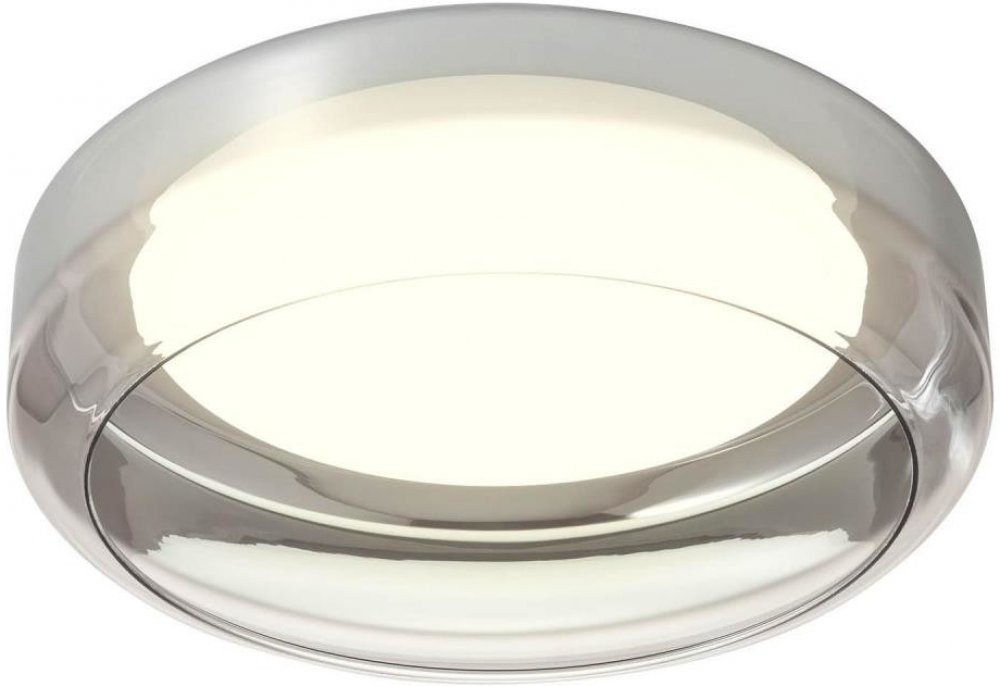 Stropní svítidlo do interiéru, vybavené LED diodami SMD, s možností volby teploty barvy světla, kovová a hliníková konstrukce elektrostaticky lakovaná pískově černou barvou, dva difuzory z foukaného skla, zvenku kouřové barvy a zevnitř opálově bílé.