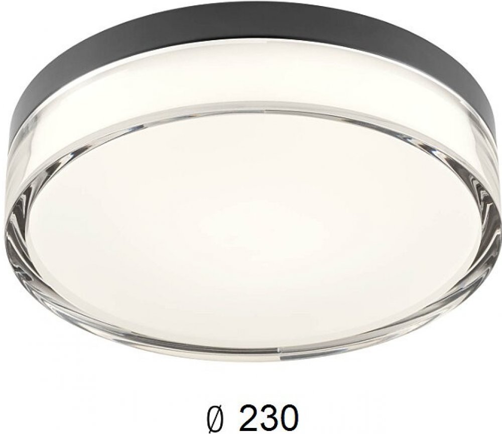 Stropní svítidlo do interiéru, chráněné proti vlhkosti, osazené LED diodami SMD, s možností volby teploty barvy světla, hliníková konstrukce lakovaná matně černou, bílou nebo chromovou barvou, a difuzor z PMMA lakovaný na vnitřní straně bíle a na vnější straně průhledný.