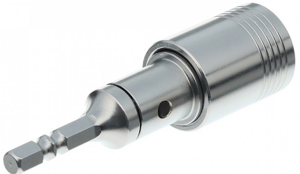 Šestihranná stopka 1/4" (6,35 mm), otvor pro vrtáky s uchycením SDS Plus. Celková délka 91 mm, průměr 21 mm.