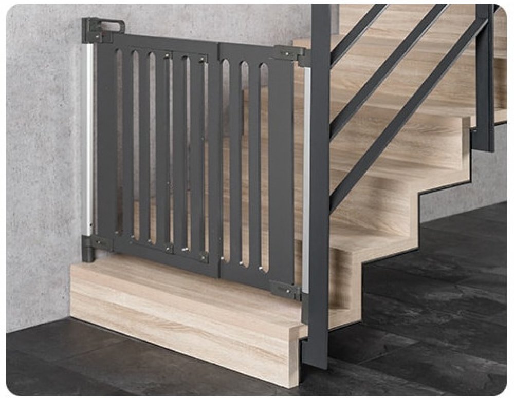Zábrana Trend nevyžaduje upínací rám. Umožňnuje tak bezbariérový průchod a je ideální pro montáž na vrchní část schodiště. Prvek dveří lze zcela otevřít v obou směrech. K dispozici je zarážka pro omezení směru otevírání.