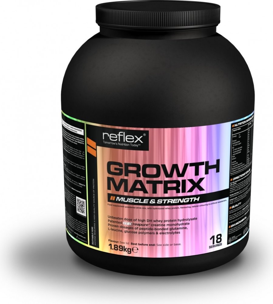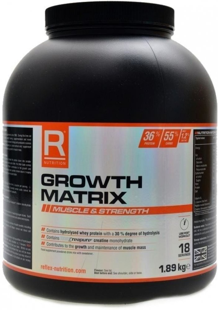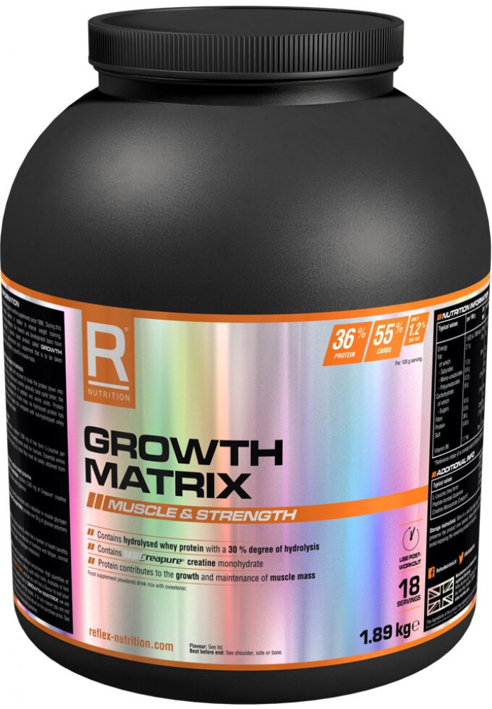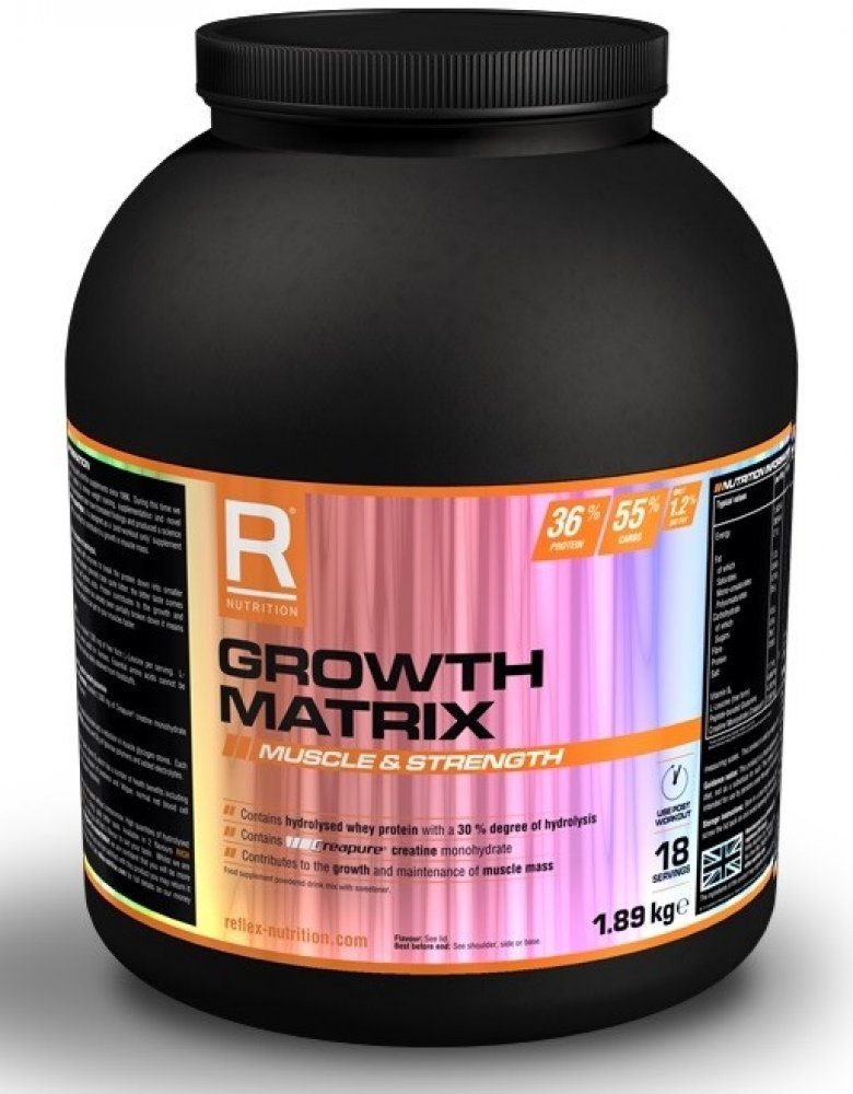 Společnost Reflex Nutrition se zabývá výrobou doplňků sportovní výživy od roku 1996. Za tu dobu jsme vytvořili důvěryhodný výzkum založený na intenzivním silovém tréninku, suplementaci a nových strategiích regenerace, které mohou stimulovat rychlý svalový růst a sílu. Náš vědecký a vývojový tým využil těchto praktických znalostí a vytvořil nofou formuli s názvem Growth Matrix. Tento jedinečný produkt je zformulován jako kompletní potréninková formule a je dávkován bezprostředně po ukončení tréninku.