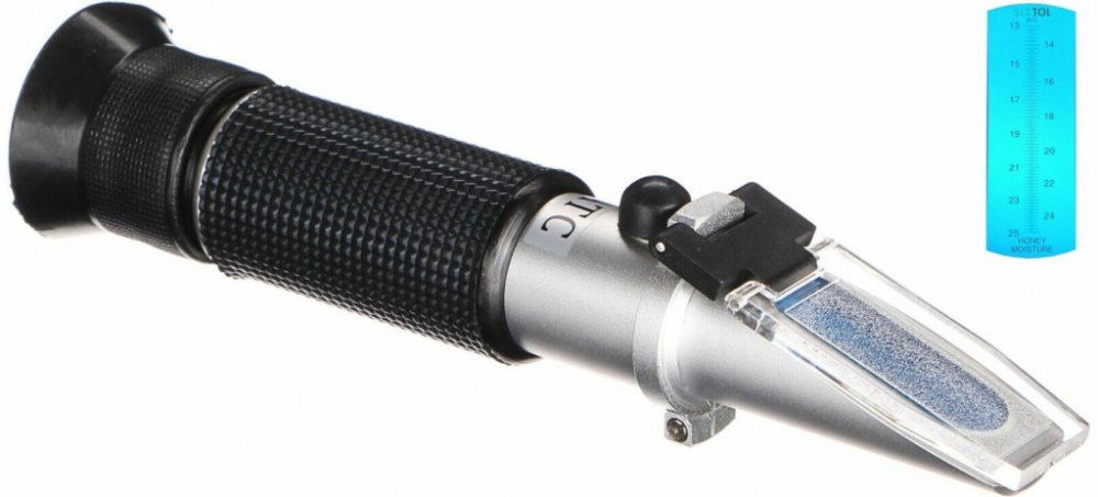 Refraktometr pro měření obsahu vody v medu ATC 25. Kvalitní optický přístroj / refraktometr na med s automatickou teplotní kompenzací je určený pro snadné, rychlé a přesné měření obsahu vody v medu v rozsahu 13 % – 25 % s rozlišením 0,1 %. Refraktometr je přístroj pro měření indexu lomu paprsku světla a takto lze určovat složení kapalných směsí či čistoty látek. Tento refraktometr se používá všude tam, kde je třeba zjišťovat kvalitu medu, respektive obsah vody v medu, např. podle Směrnice Rady 2001/110/ES, Směrnice Evropského parlamentu a Rady 2014/63/EU, vyhlášky č. 76/2003 Sb., vyhlášky č. 148/2015 Sb., Svazové normy jakosti č. ČSV 1/1999 pro získání značky ČESKÝ MED apod. Referenční teplota 20°C, refraktometr i med by měly mít při měření pro co nejvyšší přesnost teplotu přibližně 20°C. ATC / systém automatické teplotní kompenzace (při teplotě 0°C až 30°C není nutná žádná kalibrace).