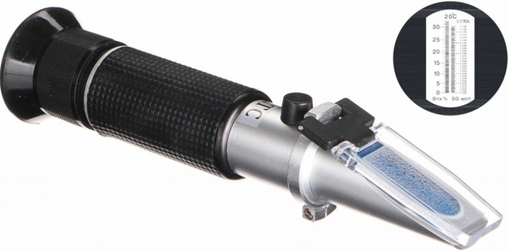 Refraktometr pro měření pivní mladiny / pivovarský cukroměr ATC 32 Kvalitní refraktometr / brixmetr s automatickou teplotní kompenzací je určený především pro měření obsahu cukru a specifické hmotnosti pivní mladiny, příp. cukernatosti ovocného kvasu a rmutu. Refraktometr je přístroj pro měření indexu lomu paprsku světla a takto lze určovat složení kapalných směsí či čistoty látek.Tento refraktometr / brixmetr se používá všude tam, kde je třeba zjišťovat procentní obsah cukru v pivní mladině (v pivní břečce) v rozsahu 0 až 32 % Brix, dále změřit specifickou hmotnost pivní mladiny v rozsahu 1.000 až 1.120 SG wort, ale například také cukernatosti ovocného kvasu a rmutu, ovocných šťáv atd. ATC / systém automatické teplotní kompenzace (při teplotě 0°C až 30°C není nutná žádná kalibrace).
