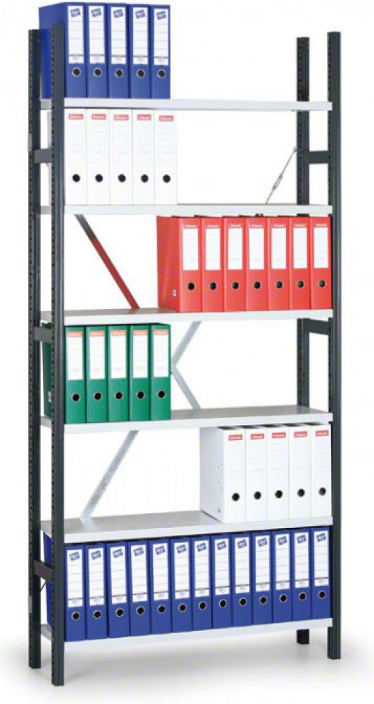 konstrukce regálu je určena především pro skladování spisů, pořadačů, apod. hloubka regálů 300 mm stojiny regálů lakované šedočernou barvou RAL 7016 nosnost polic 90 kg naprosto dostačuje pro skladování spisů, na výběr jsou buď police pozinkované nebo lakované v šedé barvě RAL 7035 snadná montáž regálů bez spojovacího materiálu regály lze rozšiřovat pomocí cenově výhodných přístavných polí