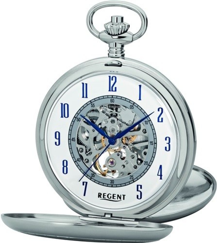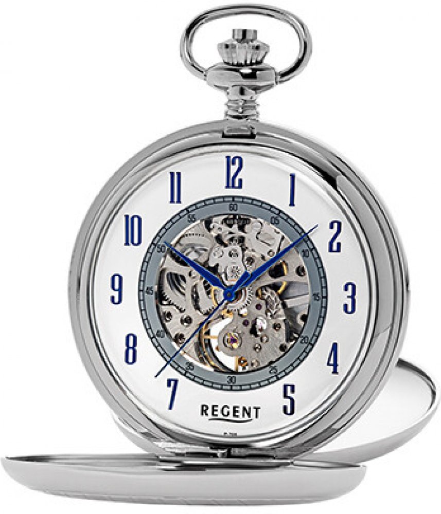 Regent analogové kapesní pánské mechanické 53 mm kov ručně natahované minerální kulaté modrá stříbrná s arabskými číslicemi 5.3 cm velké pevná 38 h bez svícení s pravidelnou údržbou (mechanické) bez chytrých funkcí