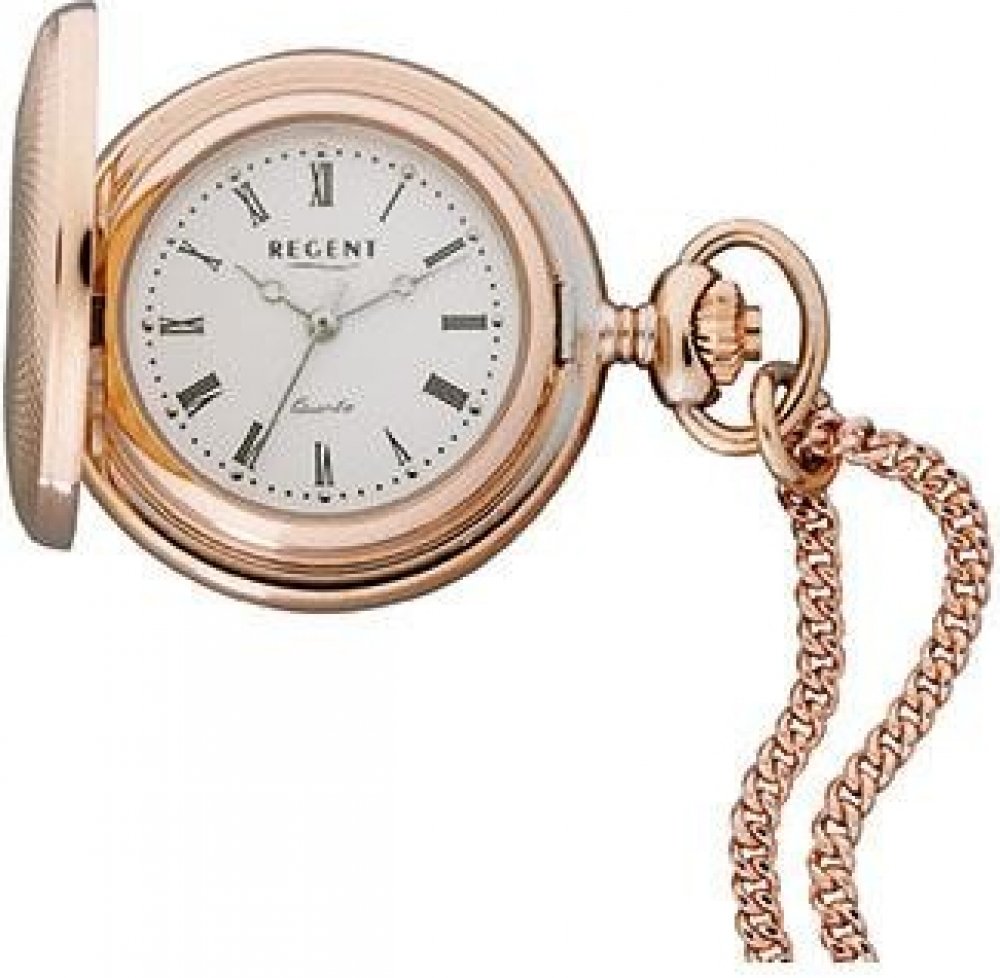 Pro ochranu skla je masivní pouzdro hodinek vyrobeno s pružinovým víkem. U tohoto modelu Regent je povrch zpracován jako ozdoba. Individuální rytina na přední straně je možná a dodává hodinkám osobní vzhled. Stisknutím korunky otevřete víko a odhalíte bílý ciferník s černými římskými číslicemi. Tyto přívěskové hodinky jsou připevněny k přiloženému řetízku pozlacenému růžovým zlatem.