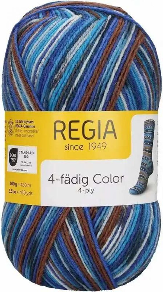 Regia 4-Ply Color 3085 campanula-chestnut color, jedná se o klasickou a známou přízi Regia a lze z ní uplést ideální ponožky.