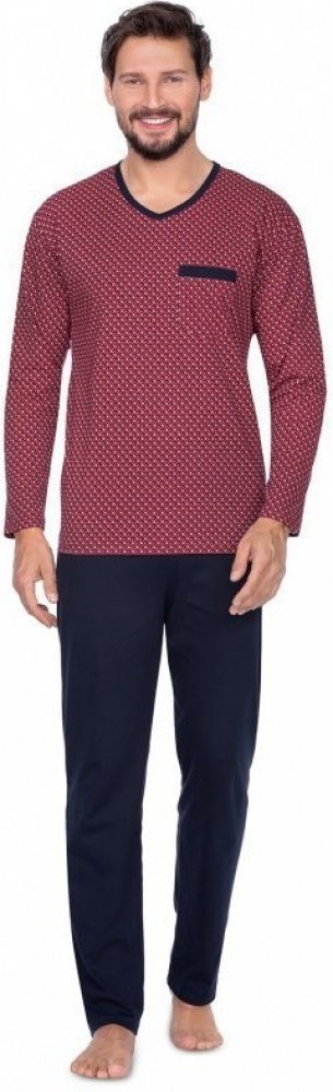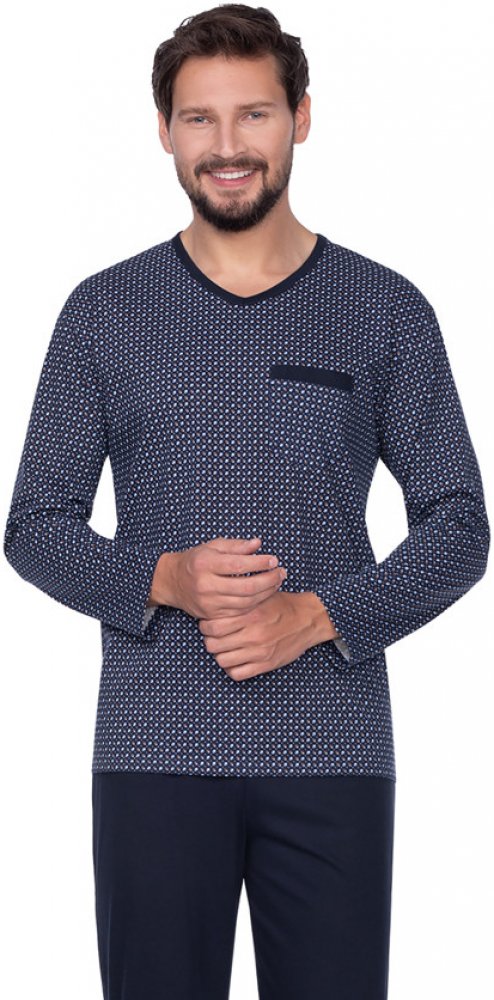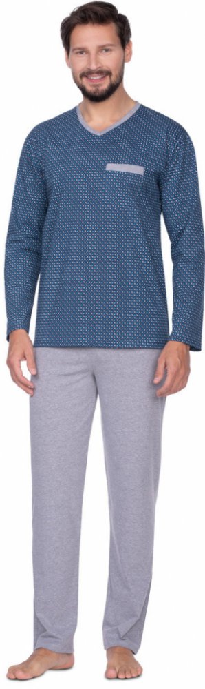 Pánské pyžamo 425/21 REGINA je Pánské vzorované pyžamo s dlouhým rukávem a jednobarevnými kalhotami. Vzorované tričko je s dlouhým rukávem a má malou kapsu na prsou. Jednobarevné kalhoty jsou šité bez kapes a mají volnou gumu v pase. Pyžamo je možné používat i jako běžné oblečení na doma.
