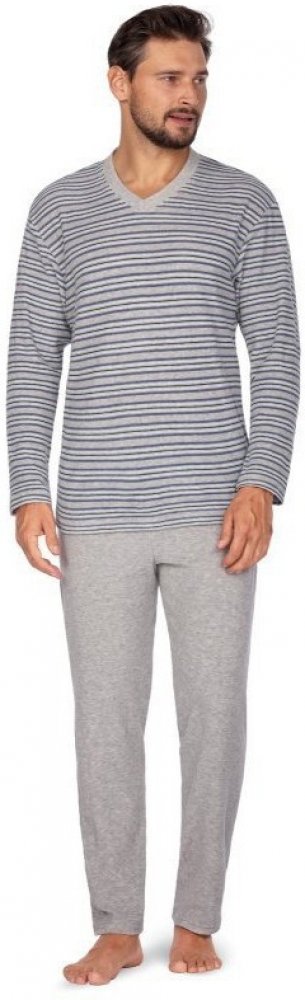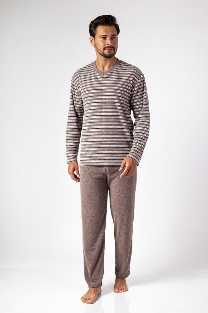 Pánské pyžamo Alex má lehce hřejivý froté materiál, který je velice příjemný na omak. Pyžamo je vyrobené z bavlny s příměsí typu froté s malými hustými kličkami po rubu. Je velice lehké, hřejivé a jemné na omak. Pyžamový vršek má dlouhé rukávy a véčkový výstřih. Pyžamové kalhoty mají v pase pružnou gumu. Mají modrou melírovanou barvu. Nohavice jsou dlouhé. Vyrobeno v EU.