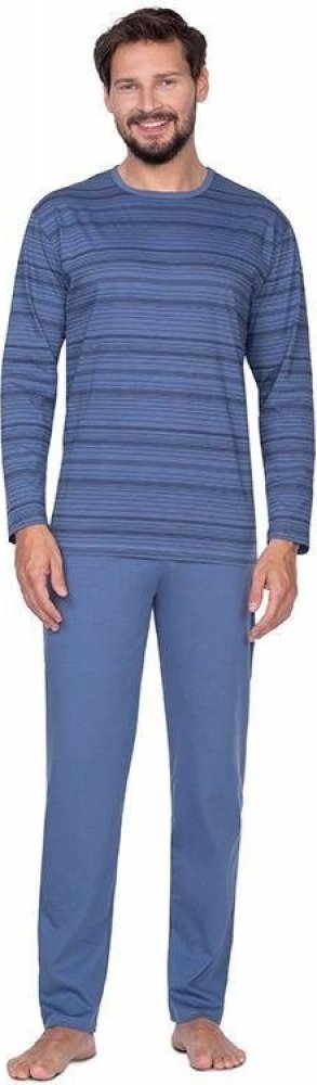 Pánské pyžamo s dlouhým rukávem a dlouhými kalhotami 592/23 Regina. Tričko je s malým obrázkem a barevným lemem kolem krku. Jednobarevné kalhoty jsou šité bez kapes a mají volnou gumu v pase. Pyžamo je ušité z kvalitní měkké bavlny, která poskytuje maximální komfort při nošení.