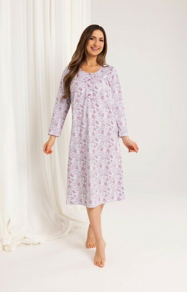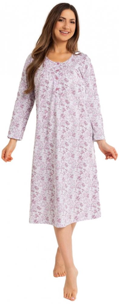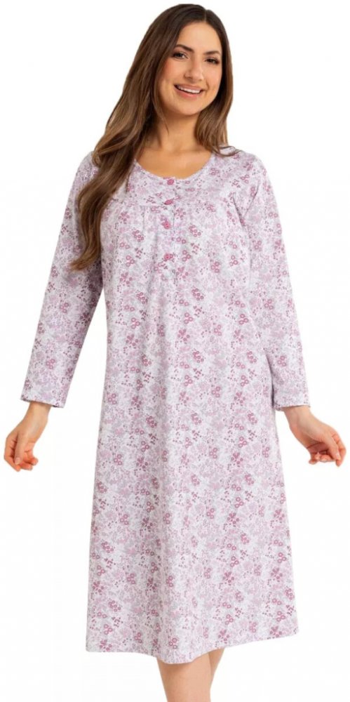 Dámská noční košile 017/51 značky REGINA přináší spojení elegance a pohodlí, které oceníte při každém večeru. Jemný květinový vzor na světlém podkladu vytváří příjemnou atmosféru pro klidné chvíle doma. Volnější střih a dlouhý rukáv zajišťují maximální komfort i během chladnějších nocí, zatímco kulatý výstřih s decentními knoflíky dodává modelu šmrnc i praktičnost. Díky použití 100% bavlny je mate...