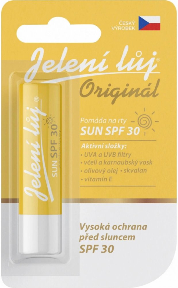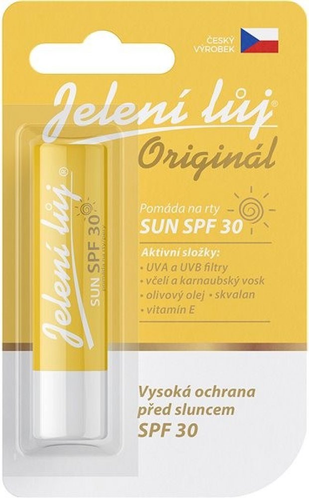 Balzám na rty JELENÍ LŮJ v blistru Sun SPF 30 chrání před sluncem v letních i zimních měsících. Na krátké procházce nebo horské túře, u vody, na sjezdovce, při jakémkoli venkovním sportu, před slunečními paprsky se jednoduše neschováme. Obličej a rty jsou přitom exponované nejvíce, proto potřebují dodatečnou ochranu. Jelení lůj Sun SPF 30 chrání rty před slunečními paprsky, extrémním horkem, mraze...