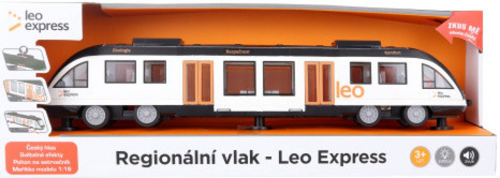 Vrhni se do světa vláčků! A přeprav cestující ze jedné stanice do druhé nejnovějším expresem. Regionální vlak LEOEXPRESS s českým hlášením, světlem, na setrvačník. Klíčové vlastnosti: České věty, český design známý z našich měst, pohon na setrvačník, světelné doplňky, rozměr boxu 48 x 10,5 x 16,5 cm. Napájení: baterie AG13 x 3 (jsou součástí hračky). Vhodné pro děti od 3 let