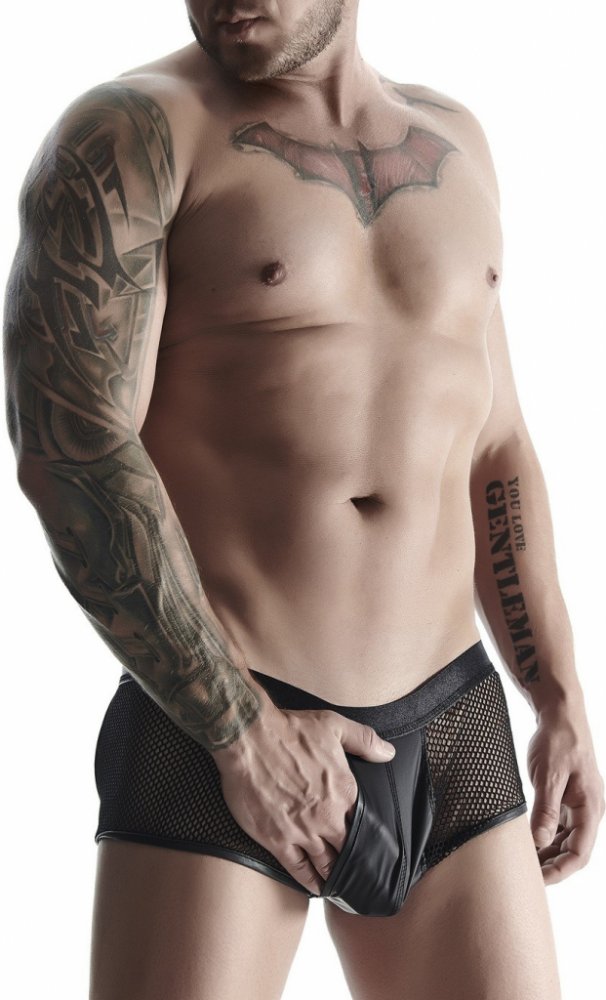 pánské gumové kalhotky s otevřenou zadní částí, ozdobným prvkem vpředu a zapínáním S/M